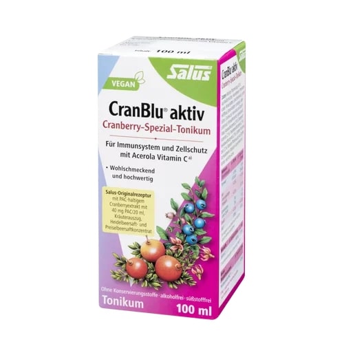 Las frutas de arándano rojo americano (Vaccinium macrocarpon) están relacionadas con los mirtilos y los arándanos rojos. CranBlu aktiv es un tónico especial, facil de digerir y sabroso, que se caracteriza por el extracto de arándano rojo americano que contiene proantocianidina (PAC) en combinación con vitamina C natural de acerola. Las proantocianidinas son polifenoles antioxidantes especiales que raramente se encuentran en esta forma en otros alimentos de origen vegetal.