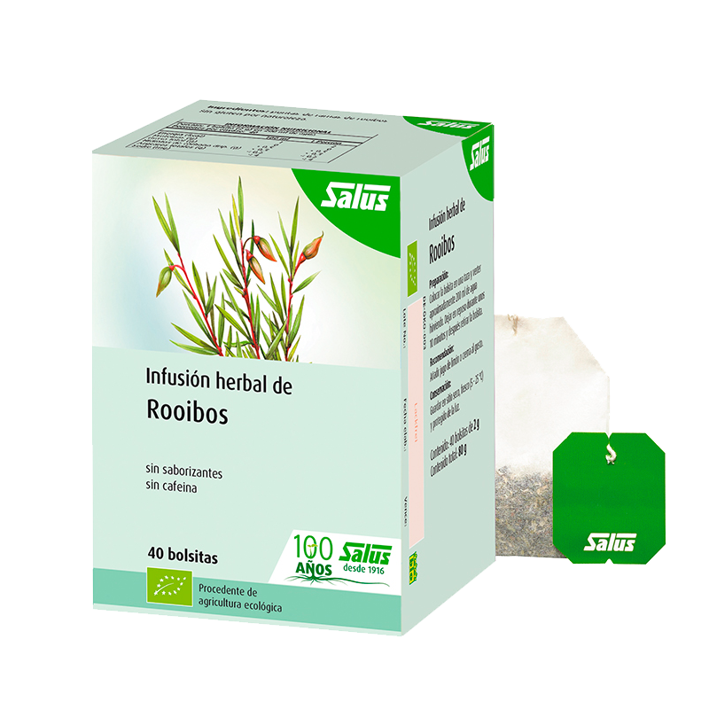Infusión herbal de Rooibos, esta variedad de té proviene de un arbusto del mismo nombre cultivado en forma orgánica en las regiones occidentales de sudáfrica. El té rooibos no contiene cafeína y solamente una cantidad menor de taninos. Por lo tanto es bien tolerado y también apto para niños. Salus garantiza la calidad de este producto con una rigurosa selección desde el origen de nuestra materia prima hasta su envasado.